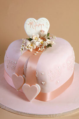 Light peach heart-shaped fondant cake with rounded edges, decorated with sugar flowers and peach ribbon, initials on heart disc on top