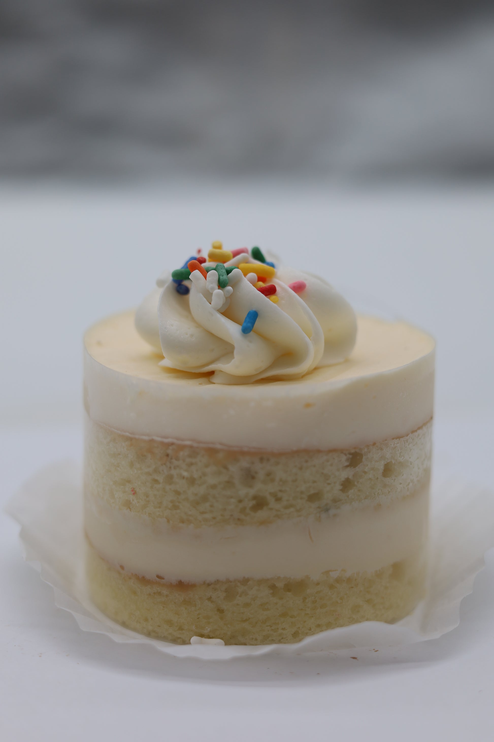 Vanilla chiffon cake layered with bavarian cream topped with a buttercream dollop and sundae sprinkles