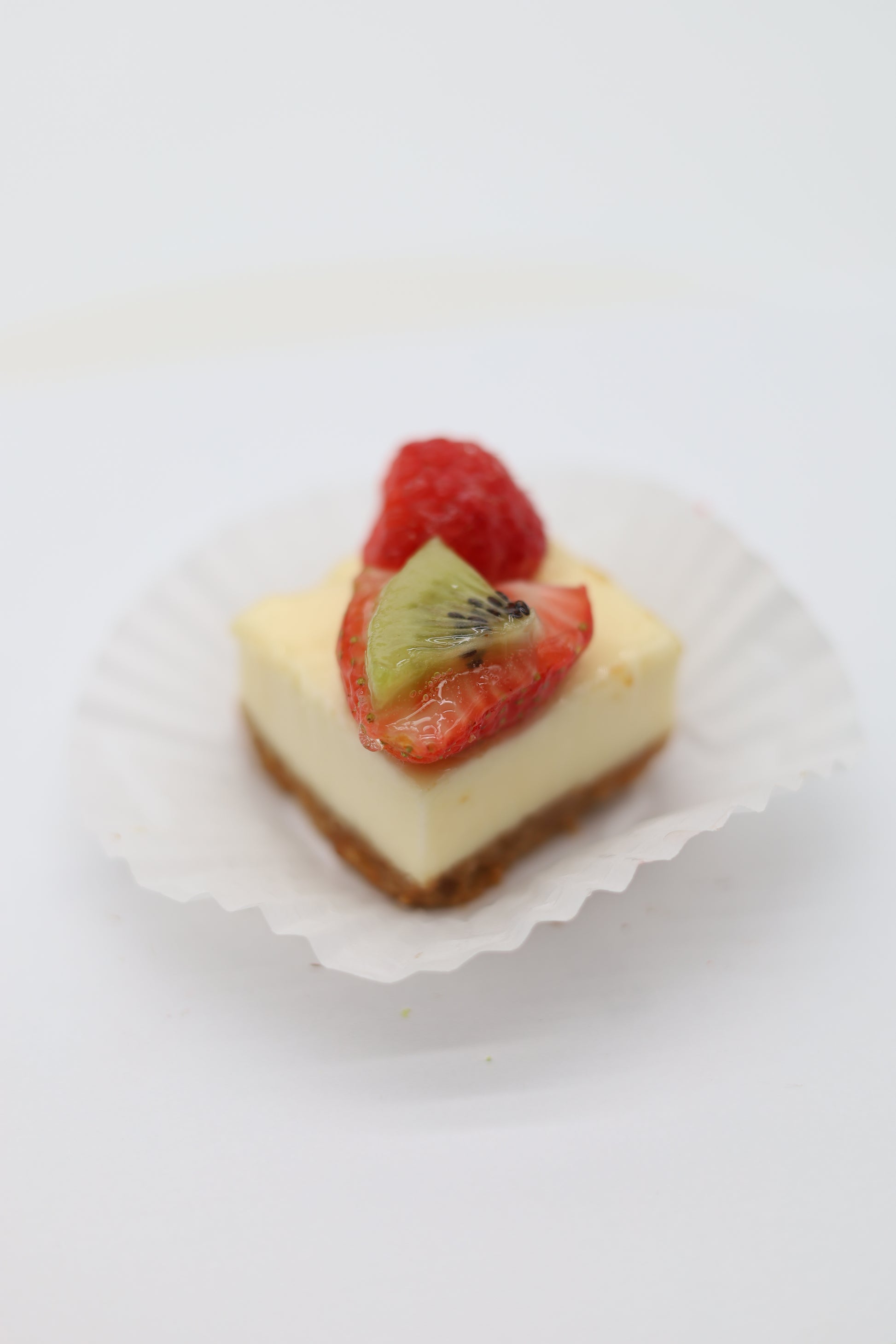 New Yory style cheesecake with graham cracker covered with glazed fresh strawberry, kiwi and raspberry.