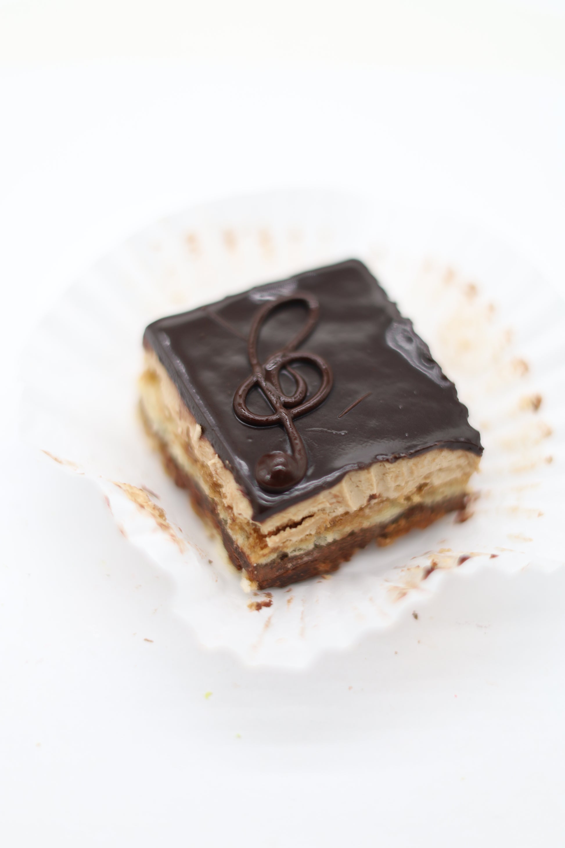 Vanilla almond cake layered with chocolate ganache and chocolate buttercream; topped with chocolate ganache.