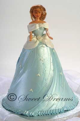 Buttercream frosting Cinderella Barbie cake with baby blue shimmer dress and small white roses.