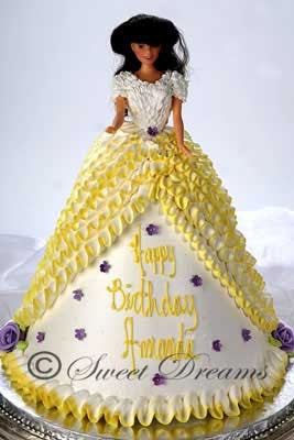 Buttercream frosting Barbie doll cake with white dress, yellow trimming, and some purple flowers.