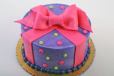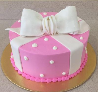 Pink buttercream frosting cake with fondant bow and buttercream frosting dots