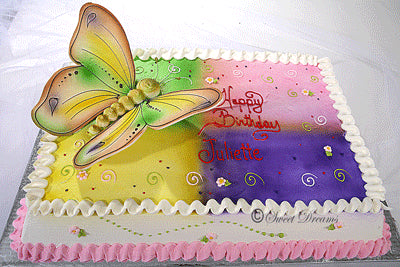 White buttercream frosting cake decorated with multi-colored butterfly on top.