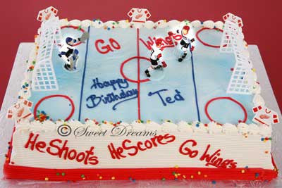 Buttercream frosting sheet cake decorated with Red Wings hockey players.