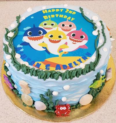 Buttercream frosting cake with Baby Shark edible image and under the sea decorations.