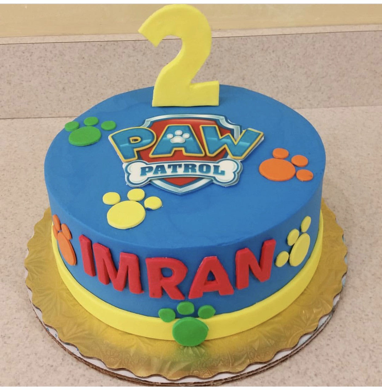 Round buttercream cake with Paw Patrol theme. Fondant details include: Fondant paws, number and name. Cake includes edible image on top.