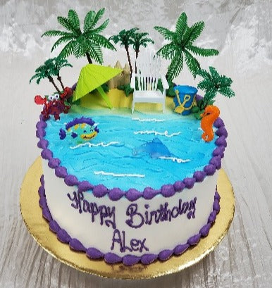 Buttercream frosting cake with beach theme. Dolphins may not be available, please call.