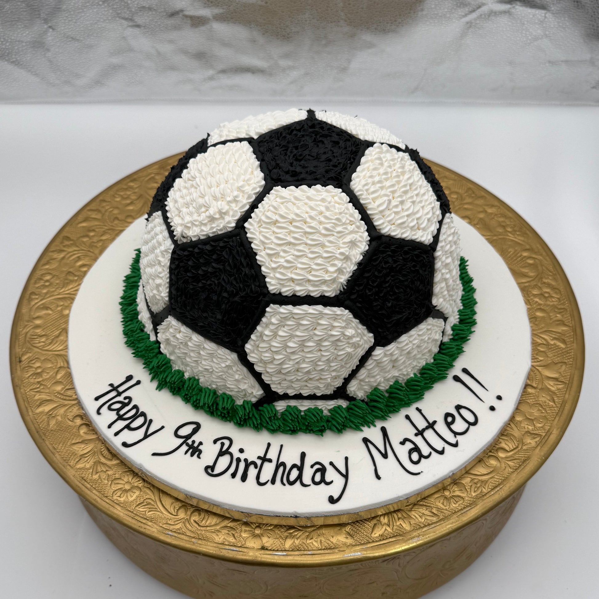 Buttercream frosting cake with "Soccer" design. Chocolate or white chocolate mousse filling only.