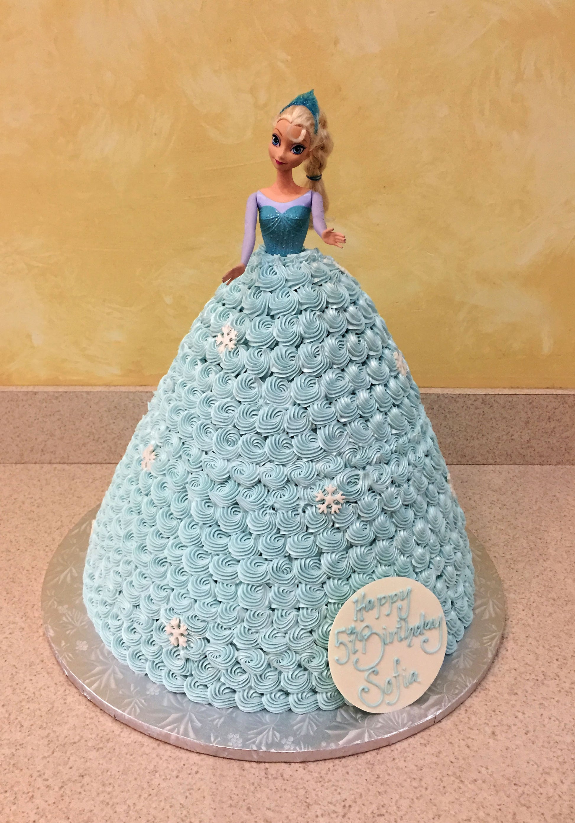 Buttercream Elsa cake with blue dress, decorated with some snowflakes.