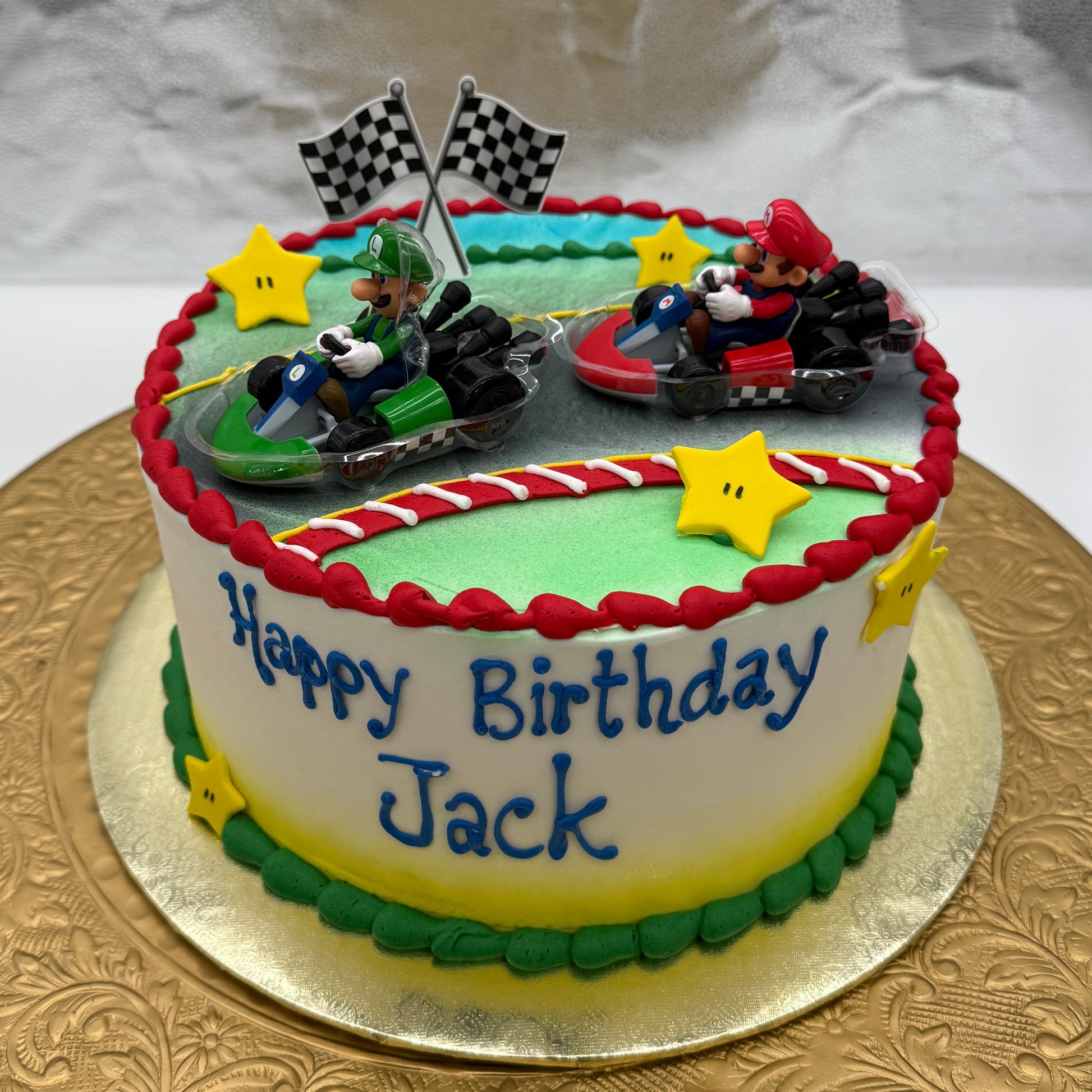 Buttercream frosting cake with Mario Kart theme with 2 cars and some fondant stars scattered on the cake.