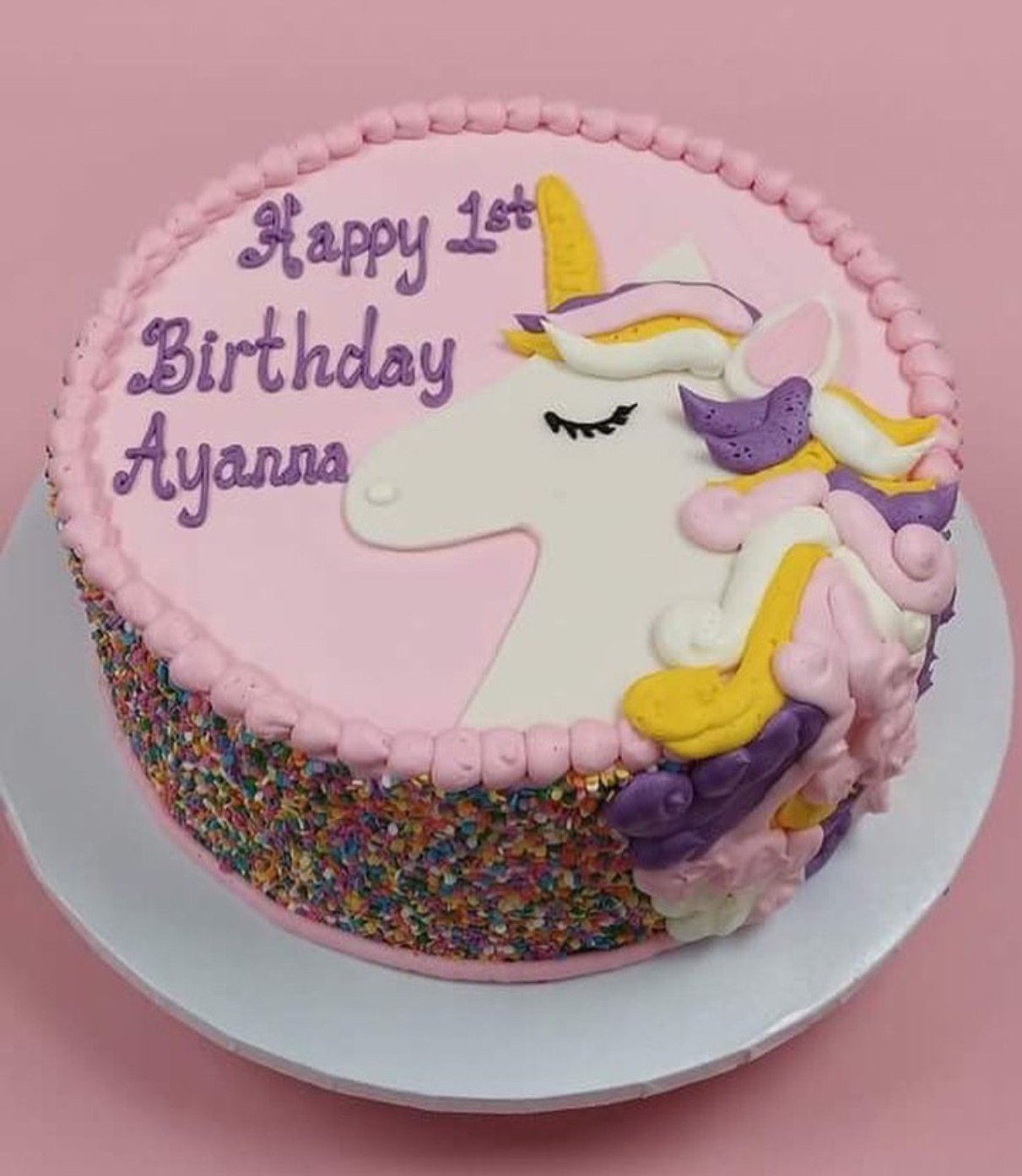 Light pink buttercream frosting with colored sprinkles on the side, fondant unicorn silhouette with multi-colored details.