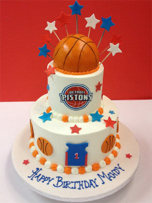 White buttercream frosting cake with "Detroit Pistons" theme.