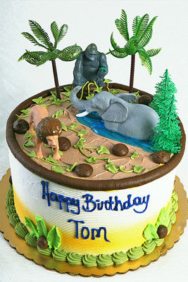 Round buttercream frosting cake with jungle theme.