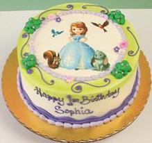 Round buttercream frosting cake with "Sofia the First" edible image and sugar flowers.