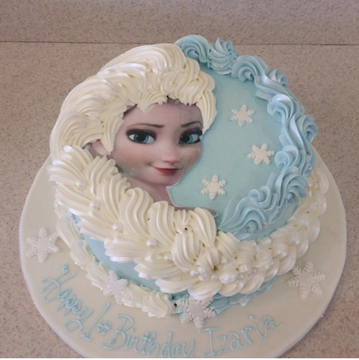 Round baby blue buttercream frosting cake with edible image of Disney Elsa, fondant snowflakes, finished with buttercream frosting braid, fondant board, and pearlized.