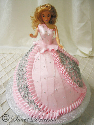 Pink buttercream frosting Barbie doll cake, decorated with a fondant one shoulder design and some gray dots & swiggles.