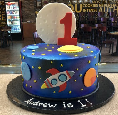 Galaxy themed cake sprayed blue with buttercream icing and fondant planet and spaceship.