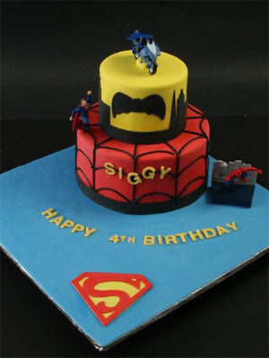 Multi-tiered fondant superhero themed cake.