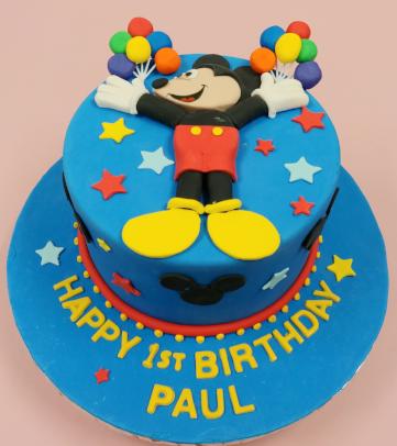 Fondant round cake with a Mickey Mouse made out of fondant on the top of the cake. Name/message is on board. Fondant balloons and stars on the top.