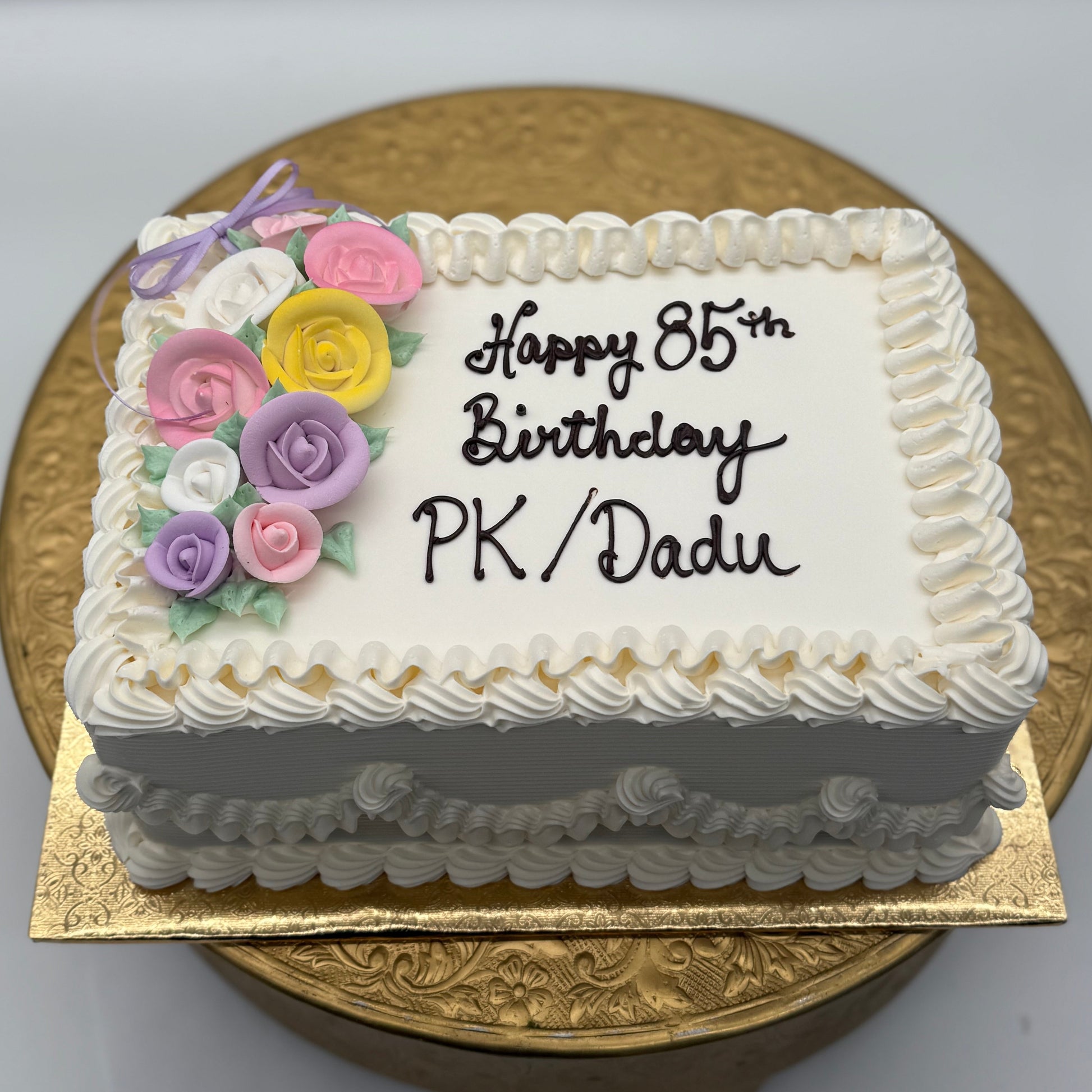 White buttercream frosting cake decorated with multicolored sugar flowers on top.