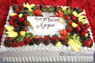 White buttercream frosting cake decorated with fresh fruit around the edges on top of the cake.