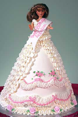 Buttercream frosting Barbie doll cake with white dress, some pink flowers, and writing on a banner draped on the shoulder.