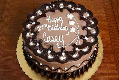 Buttercream frosting cake decorated with chocolate buttercream, dark chocolate trimming and some white details.