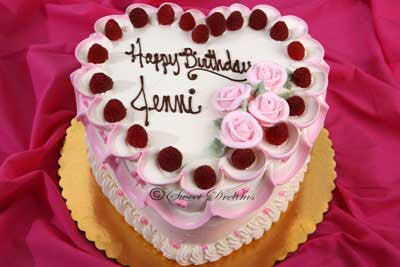 White heart-shaped buttercream frosting cake with raspberries around the edge, pink details, and some pink sugar flowers.