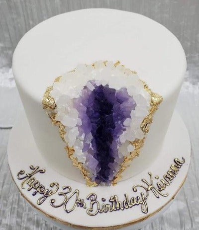 White fondant round cake with colored sugar crystal design and a gold painted perimeter.