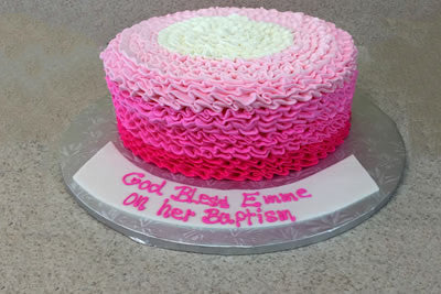 Round buttercream cake with pink graduated ruffles. (picture shown is 9")