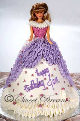 Buttercream frosting Barbie doll cake with maroon top, white and purple colored dress, and maroon buttercream flowers and purple writing.