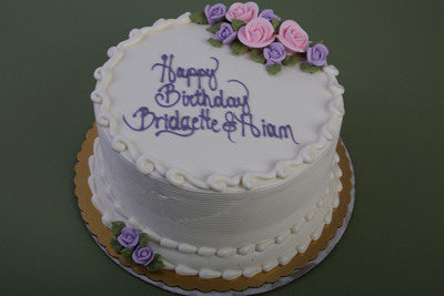White buttercream frosting cake with pink and purple sugar flowers.
