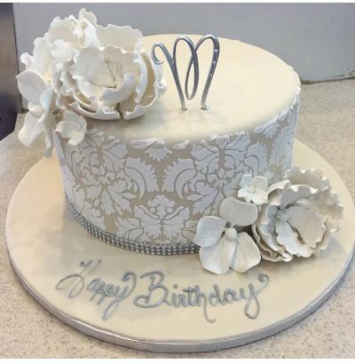 Round fondant cake with white damask style, rhinestone ribbon and sugar flowers. Monogram is not included.