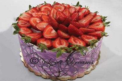 Vanilla chiffon cake layered with white chocolate mousse, mixed berries, and topped with glazed strawberries.