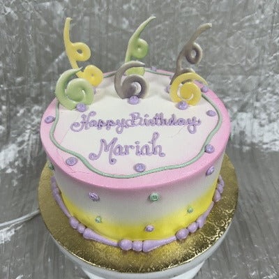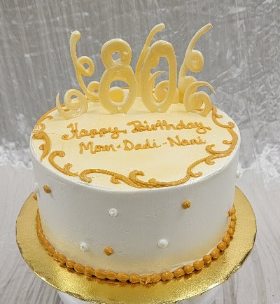 Round buttercream cake with gold and white details, finished with white chocolate swirls and a white chocolate #80