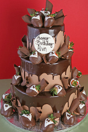 Multi-tier chocolate cake decorated with chocolate covered strawberries all around the cake.