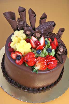 Tropical Fantasy, a chocolate cake glazed with ganache and decorated with some fresh glazed fruits on top.