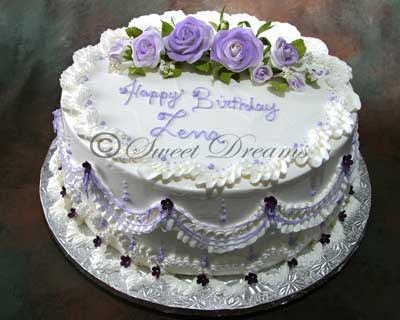 Round buttercream frosting cake with lavender details, lavender sugar flowers on top, and purple forget-me-not flowers on the side of the cake.