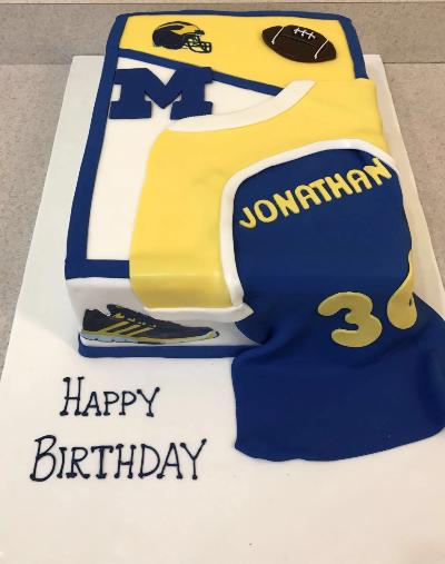 Fondant sheet cake, one size only, U of M theme, fondant jersey, fondant M, fondant ball and edible images of helmet & shoe.