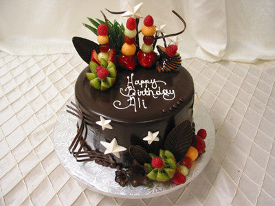Chocolate ganache cake decorated with fruits and chocolate details.