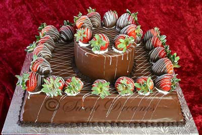 Chocolate sheet cake with a round chocolate cake on top with chocolate covered strawberries all around and white strips.