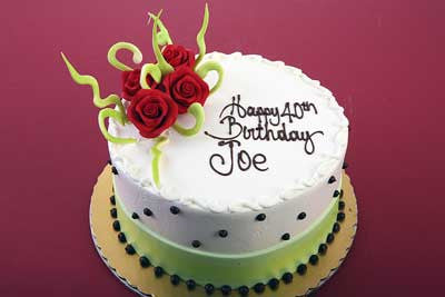 Round buttercream frosting cake with lime green fondant ribbon around the bottom, red sugar flowers on top, and some white chocolate decor.