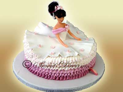 Round fondant ballerina Barbie with white and pink buttercream ruffles on the side.