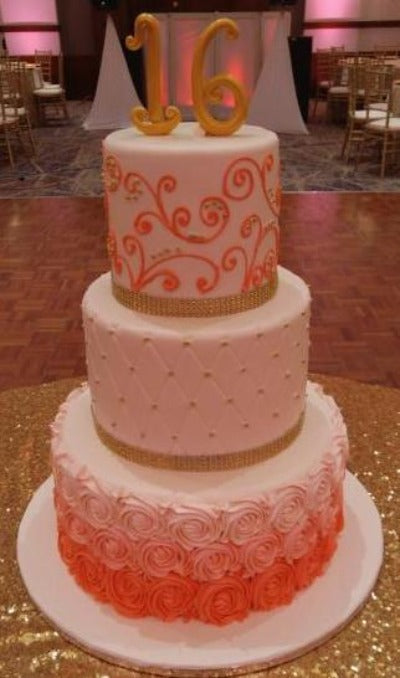 Sweet 16 white fondant tiered cake with coral colors and non edible crystal ribbon.