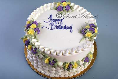 White, round buttercream frosting cake with basket weave design in front and purple and yellow flowers.