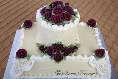 Yellow buttercream frosted sheet cake with round cake on the top, white buttercream decoration and burgundy sugar flowers.