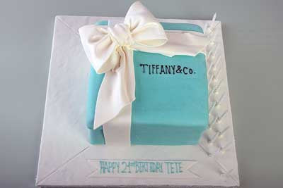 Tiffany Blue fondant square cake decorated with white fondant bow.