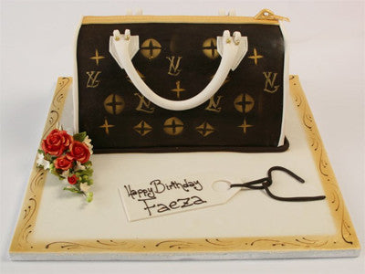 Fondant designer purse cake with "Louis Vuitton" theme.