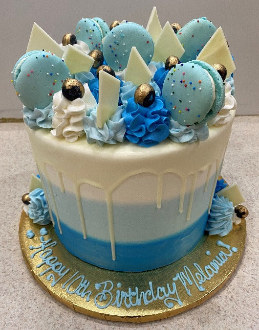 Elevated round cake with drip, macarons and gold painted blackberries with 2-toned purple icing with the message on board.
